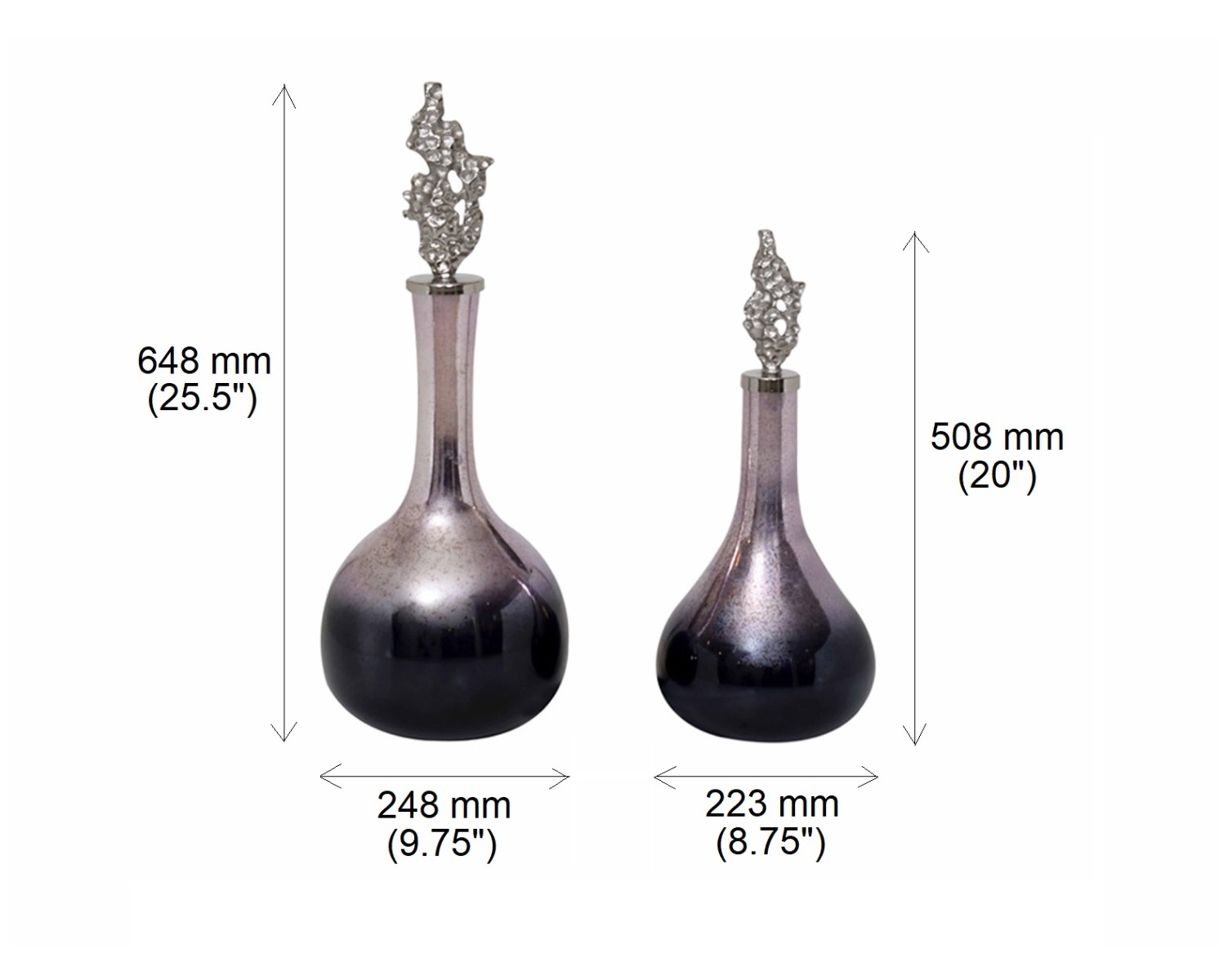 Decorative bottle in dewberry luster glass with ornamental aluminium lid.