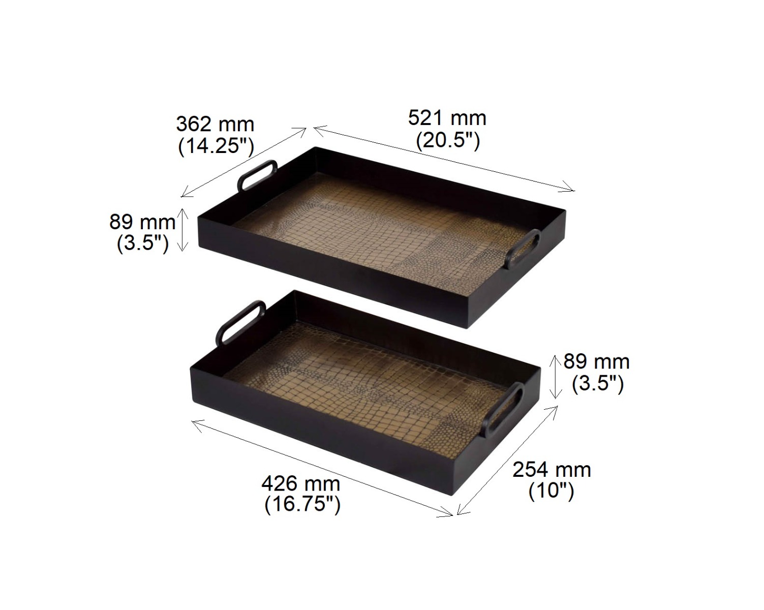 Rectangular tray in croc etched design in matt antique brass finished base with matt black frame and handles.