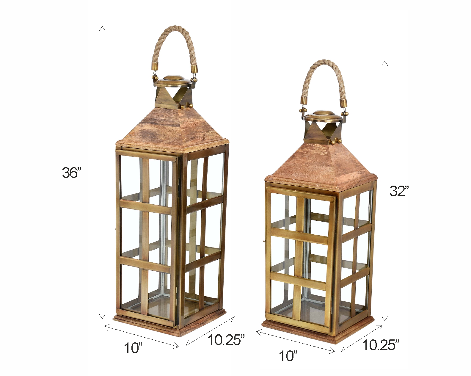 Lantern in mango wood with clear glass and brass plated stainless steel with woven rope handle.