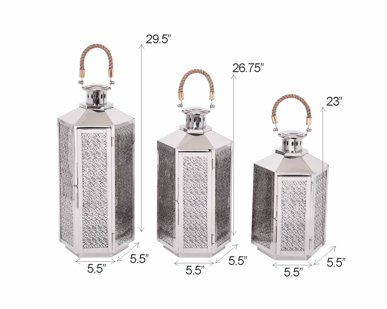 Electric lantern in high polished stainless steel ornate design to filter light with rope handle.