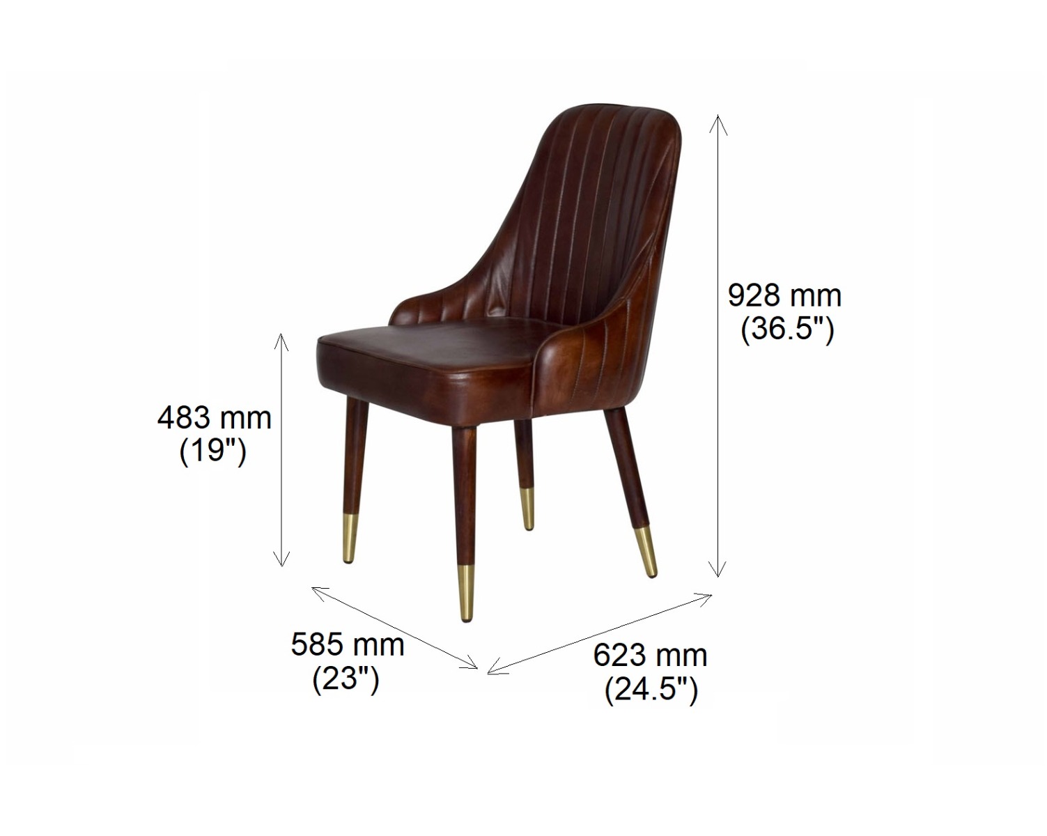 This rich contemporary dining chair in genuine leather makes for a luxurious dining experience. It comes with a quilted cushioned back in acacia wood with metal splayed legs.