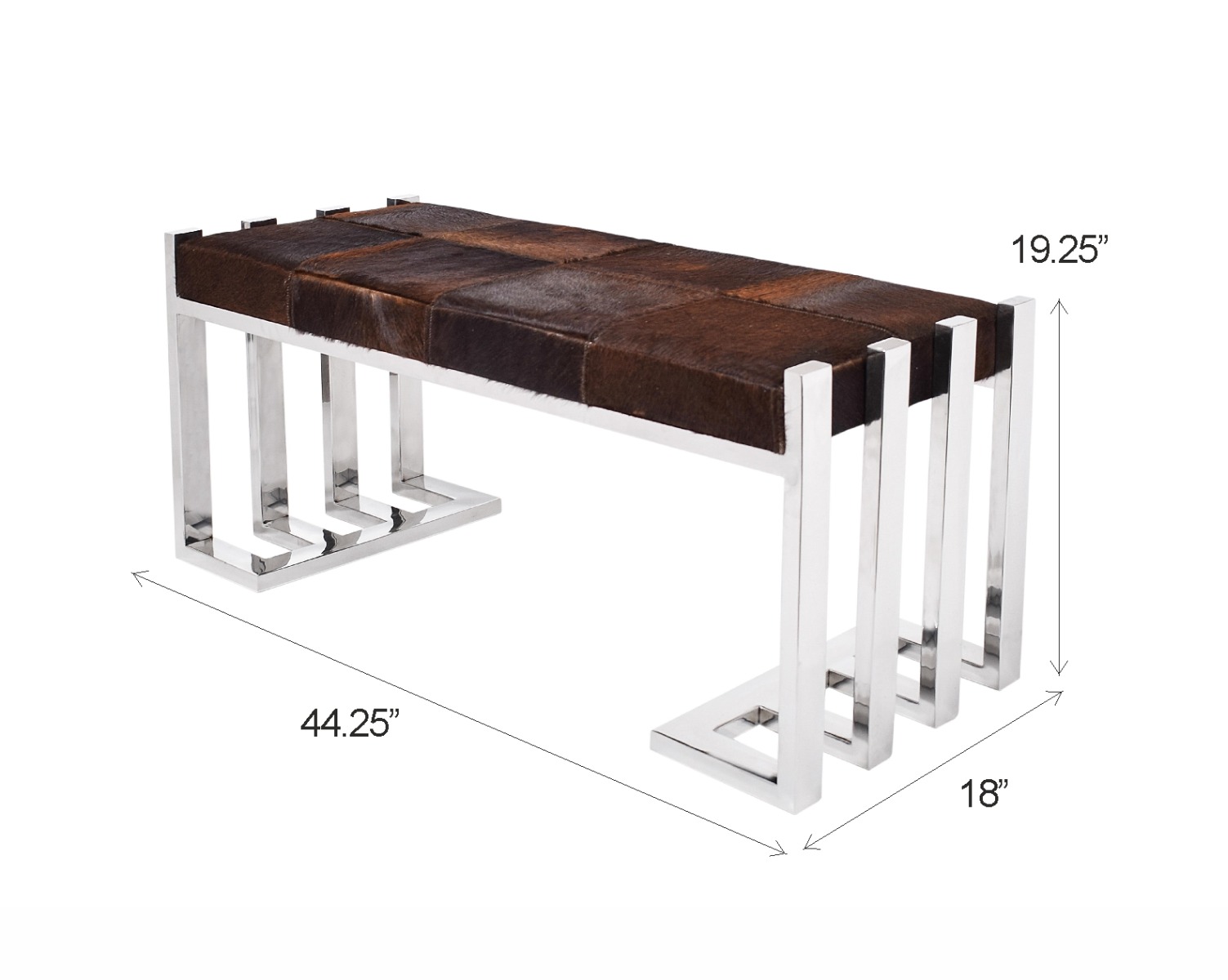 Double bench upholstered in light brown hide seat and high polished stainless steel legs in rich contemporary design.
