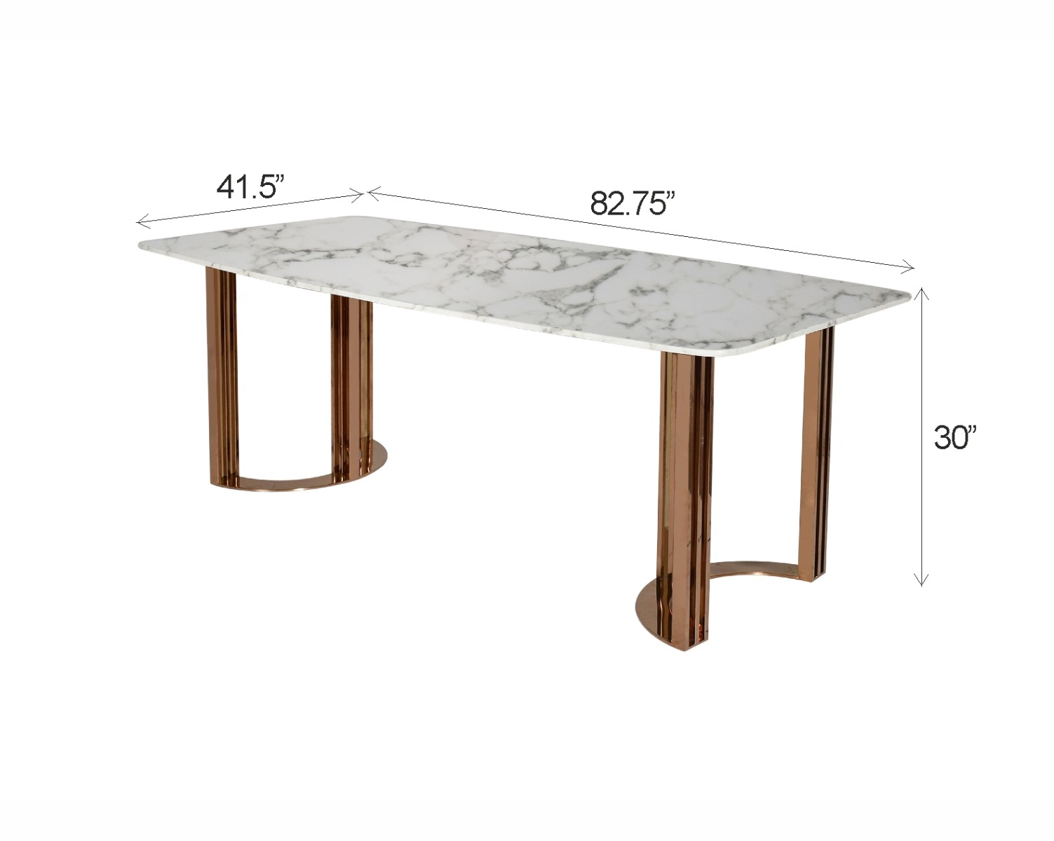 8 Seater rectangular dining table with white marble top and high polished rose gold plated stainless steel base.