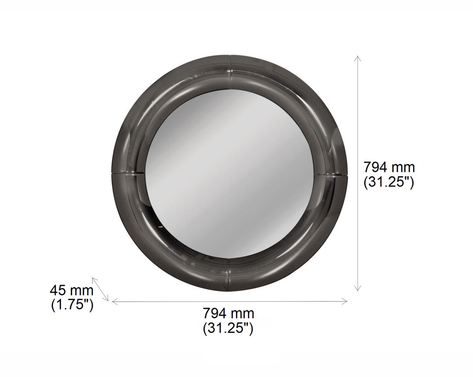 Round wall mirror with grey curved mirror border in rich contemporary design.