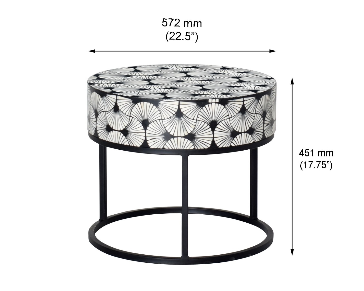 This gorgeous black and white inlay end table in floral pattern with a black metal base is a perfect statement piece in your living room.
