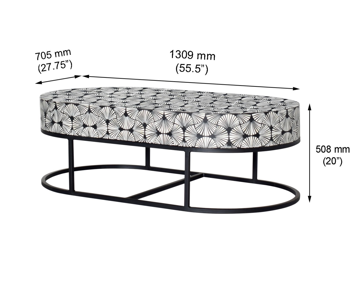 This gorgeous black and white inlay coffee table in floral pattern with a black metal base is a perfect statement piece in your living room. It is a masterwork in inlay in an elaborate pattern.
