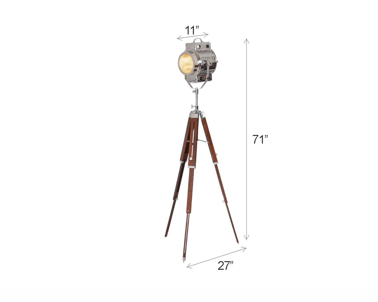 Studio tripod lamp in silver nickel and wood with height-adjustable lever.