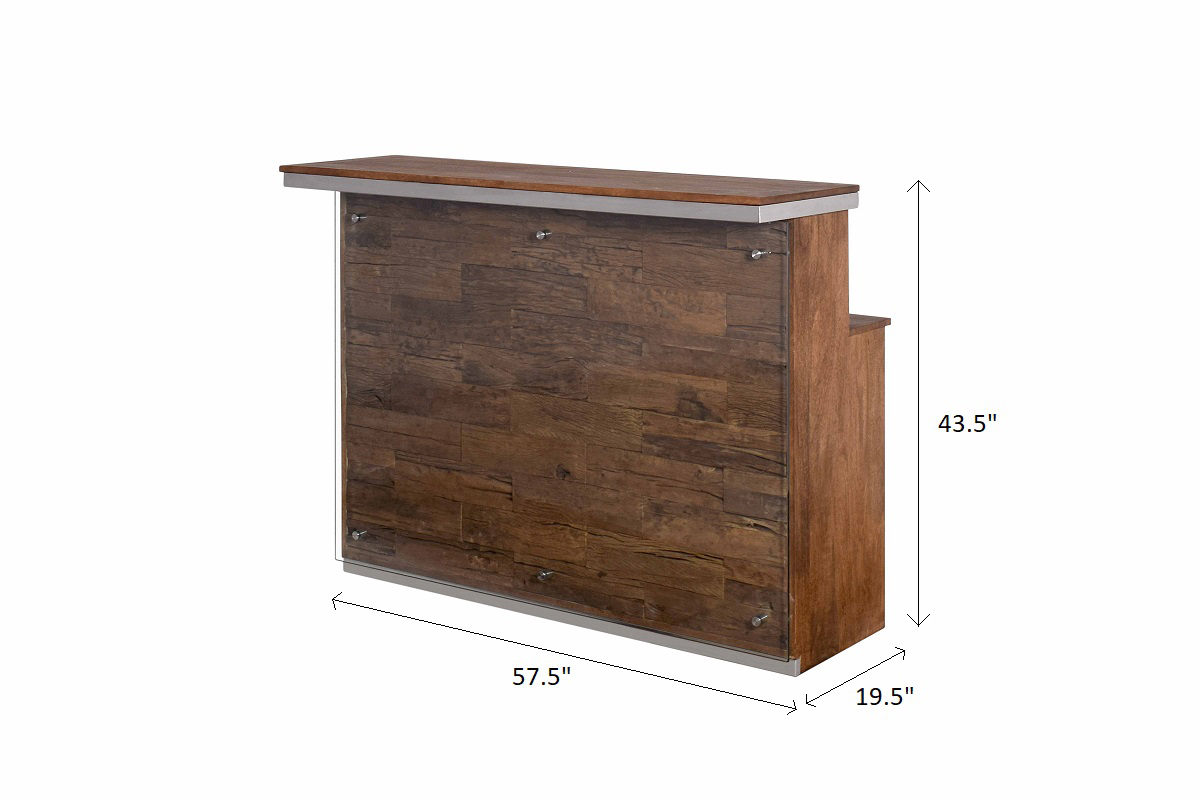 Bar counter in mango wood and stainless steel, with front in glass and sleeper wood which has been recycled from railway tracks in a rustic & natural finish with storage.