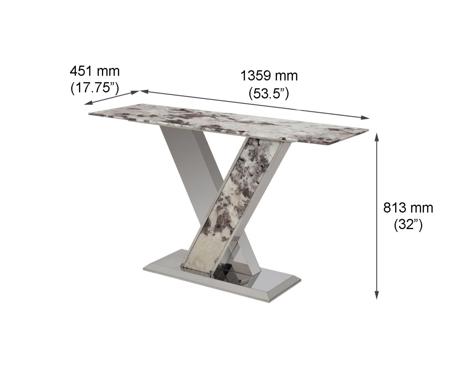 A stylish console with a natural white marble top and a glistening stainless steel crisscross base. Its genuine marble top adds a refined touch to your décor, while its chrome base and stainless steel legs bring shimmering style to any space.