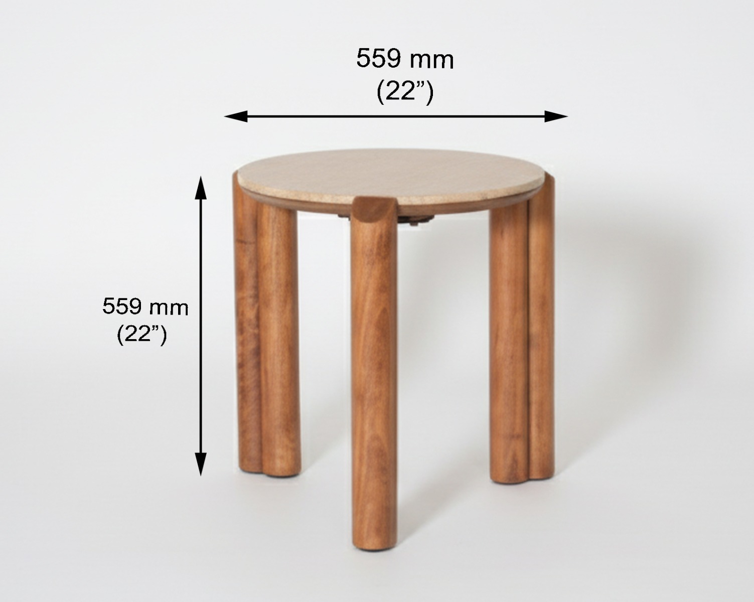 This round coffee and end table set features travertine marble tops with a solid wooden base.