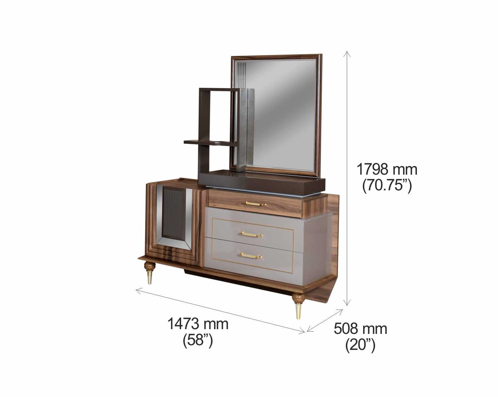 This beautiful art deco style dresser comes with a mirror to compliment it in light walnut veneer & glossy grey finish. It has a unique extra storage space which slides out, it has 3 drawers & cabinet storage.