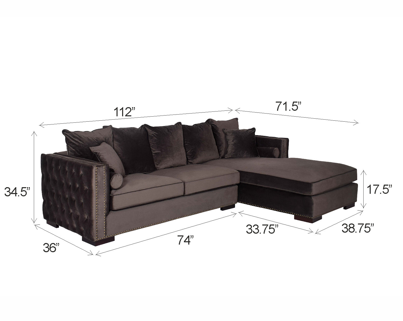 Left and right aligned sectional sofa with chaise, upholstered in fabric and tufted on the sides with antique gold rivets on the arms and front , the sofa comes with cushions to match and has wooden legs.