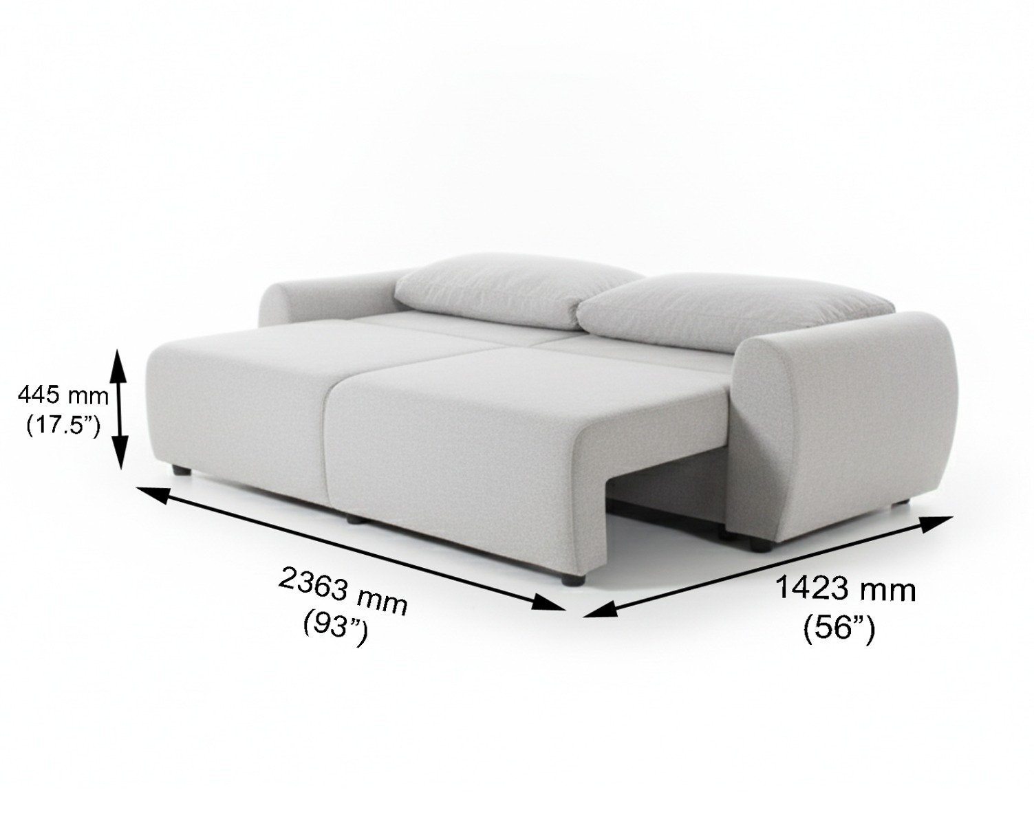 Our stylish sofa cum bed enhances the aesthetic appeal of your living space. Featuring wide curved armrests upholstered in fabric with sturdy wooden legs, it easily transforms into a bed with its smooth pull-out mechanism and foldable back—perfect for hosting guests with ease and style.